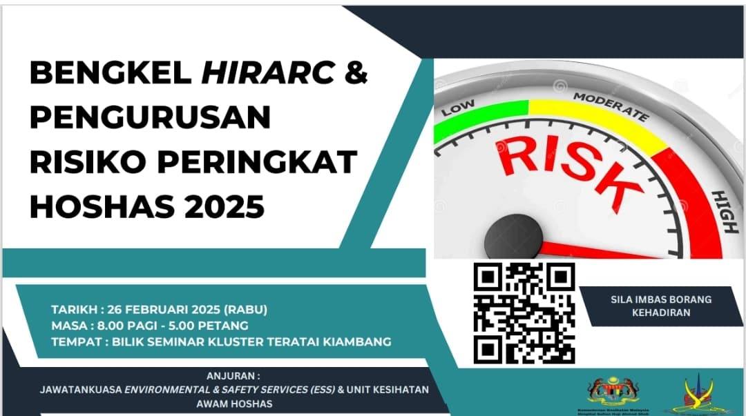 Pada 26 Februari 2025, satu program yang dinamakan sebagai Bengkel HIRARC dan Pengurusan Risiko peringkat hospital telah diadakan bertempat di Bilik Seminar Kluster Teratai Kiambang anjuran Jawatankuasa Environmental and Safety Services ( ESS ) dan Unit Kesihatan Awam HoSHAS