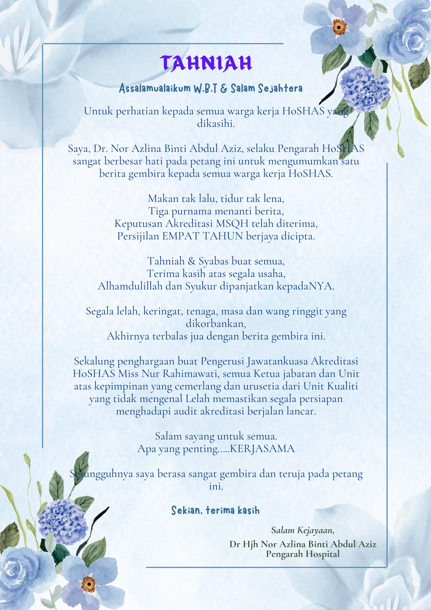 • Penghargaan Buat Kakitangan HoSHAS Sempena Persijilan MSQH 4 tahun